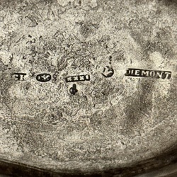 | Omschrijving | Een antieke Empire eerste gehalte (925/1000) zilveren koffiepot. Ovaal model, met ebbenhouten greep. Aan de onderzijde gemerkt met staande leeuw, stadskeur Amsterdam, jaarletter Y (1807), winkeliersmerk Diemont en meesterteken CH. |