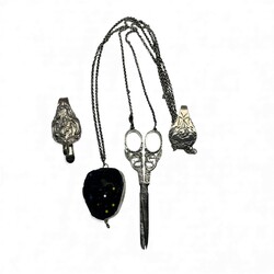 | Kavel | 345. Friese chatelaine met rokhaak, naaischaar en speldenkussen |