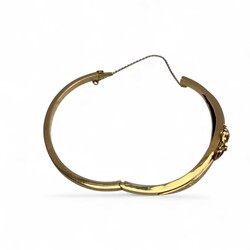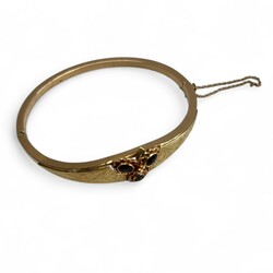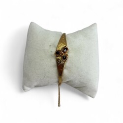 | Omschrijving | Een 20e eeuwse 14 karaats (585/1000) geelgouden armband, gegraveerd en centraal bezet met drie gefacetteerde granaatjes. |