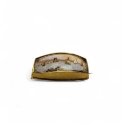 | Omschrijving | Een antieke 19e eeuwse 14 karaats (585/1000) gouden broche, langwerpig model. Met centraal een gebogen camee, voorstelling van vier zeilschepen voor de kust, in een 14 karaats (585/1000) Nederlands geelgouden montuur, rand met banddecor, gemerkt met oud eikenblaadje. |