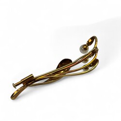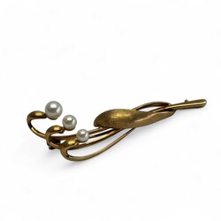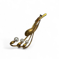 | Omschrijving | Een 20e eeuwse 14 karaats (585/1000) geelgouden fantasiebroche, gedeeltelijk gesatineerd, aan de rechterzijde bezet met drie parels in oplopend formaat. Gemerkt op de speld met eikenblaadje. |