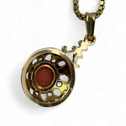 | Omschrijving | Een lang 20e eeuws 14 karaats (585/1000) geelgouden collier, met daaraan een hanger met ronde bloedkoraal. Hanger en collier gekeurd ‘585’. |