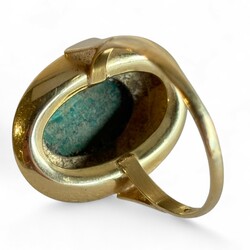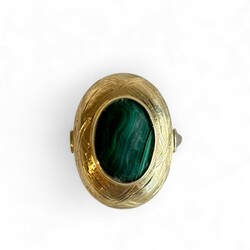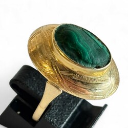 | Omschrijving | Een 20e eeuwse 14 karaats (585/1000) geelgouden damesring, bezet met ovaal geslepen malachiet, rondom gegraveerd. Gemerkt met nieuw eikenblaadje (1953-heden) en onduidelijk meesterteken. |