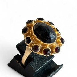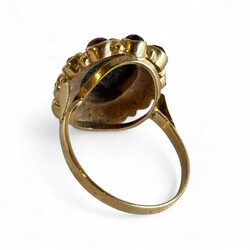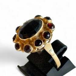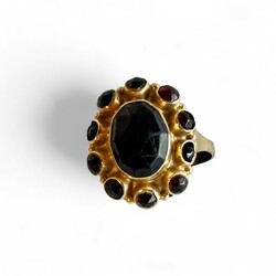 | Omschrijving | Een 20e eeuwse 14 karaats (585/1000) geelgouden damesring, centraal bezet met ovale, gefacetteerde granaat, en rondom bezet met tien ronde gefacetteerde granaatjes. Gekeurd met onduidelijk meesterteken. |