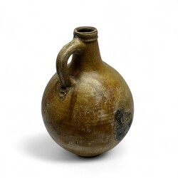 | Omschrijving | Een grote antieke Duitse baardmankruik. Bolbormig model met oor, met zoutglazuur en rondom versierd met drie medaillons. Westerwald, 17e eeuw. |