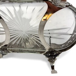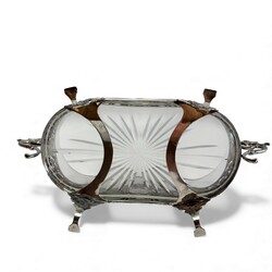 | Omschrijving | Een 20e eeuwse jardiniere. Kristallen binnenbak met sterslijpsel, in rijk gedecoreerd eerste gehalte (925/1000) zilveren montuur met cartouches, guirlandes en rozetten, op kruilpootjes. Aan de onderzijde gemerkt Aubert, Den Haag, jaarletter K (1970). |