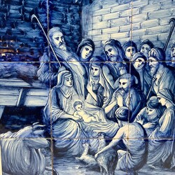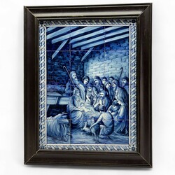| Omschrijving | Een vroeg 20e eeuws twaalfpas tegeltableau, blauw-wit, met voorstelling van de geboorte van Jezus in de stal. Tichelaar, Makkum. |