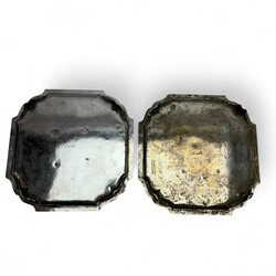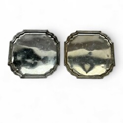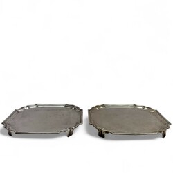| Omschrijving | Lot van twee 18e eeuwse zilveren cabaretjes. Vierkant model, met gecontourneerde rand, geplaatst op vier pootjes.. Aan de onderzijde gekeurd met staande leeuw onder kroon, ooievaar (stadskeur Den Haag), jaarletter A (1772) en meesterteken WIK = mr. Willem Jan Keer, werkzaam van 1743 tot 1793. Met trembleerstreken en latere inscriptie ‘J.d.H.’. |
