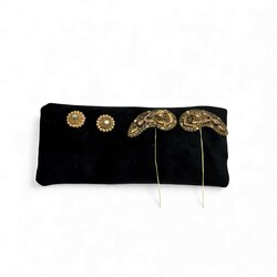 | Omschrijving | Lot van vier 19e eeuwse 14 karaats (585/1000) geelgouden oorijzerspelden: twee met ronde knop, bezet met rotskristal, en een set volledig filigrain bewerkt. |