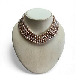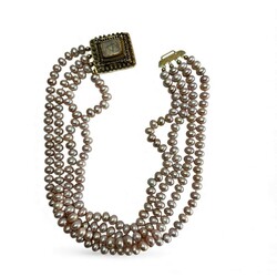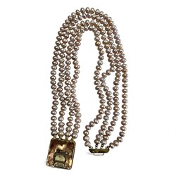 | Omschrijving | Een vierrijig roze parelsnoer met antiek 19e eeuwse 14 karaats (585/1000) geelgouden Volendammes slot, filigran bewerkt met knopjes en centraal met beschildering van bootje achter glas. Slot gemerkt met eikenblaadje |