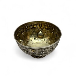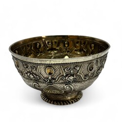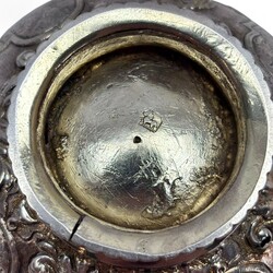 | Omschrijving | Een antieke vroeg 18e eeuwse Fries zilveren roomkom. Rond model, rijk gedreven en gegraveerd, met decor van o.a. schelpmotieven en cartouches. Aan de onderzijde gemerkt met meesterteken ‘paard’ = mr. Karst Karsten Ros I (Harlingen 1686- Workum 1719), als zilversmid werkzaam te Workum van 1707 tot 1735 (na 1719 voortgezet door zijn weduwe/knecht.. Zie voor een ander exemplaar van Ros met identieke schelpmotieven collectie Ottema Kingma Stichting, NO 03217. |