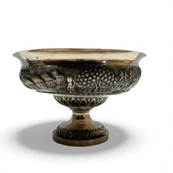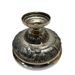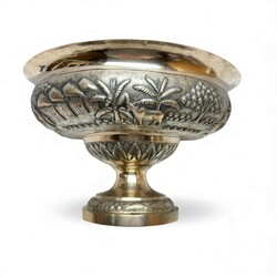 | Omschrijving | Een antieke vroeg 20e eeuwse zilveren schaal, rijk gedreven met voorstelling van o.a. een boer met een koe, hutten met rieken daken, vrouw met kruik op haar hoofd, vissers aan de waterkant en een moeder met kind. Vermoedelijk Lucknow, ca. 1920. |