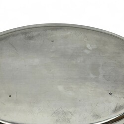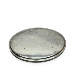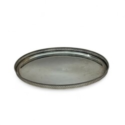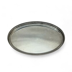 | Omschrijving | Een 20e eeuws tweede gehalte (835/1000) zilveren dienblaadje, met opstaande, gecanneleerde rand en parelrand. Aan de onderzijde gekeurd met lopende leeuw, jaarletter R (1927) en meesterteken H+P = fa. Presburg, Haarlem |