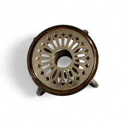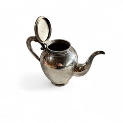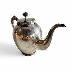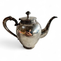 | Omschrijving | Een 20e eeuwse tweede gehalte (835/1000) zilveren theepot op komfoor. Theepot versierd met parelrand op knop en randen, gemerkt met importkeur ‘ZII’ en importeursteken ‘DA+’ = Aubert, Den Haag. Op bijpassend komfoor, gemerkt ‘835’. |