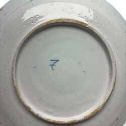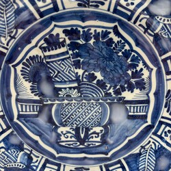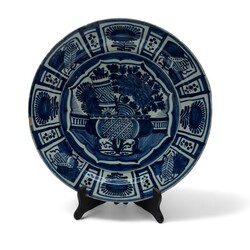 | Omschrijving | Een laat 17e eeuws Delfts aardewerken schotel, 35 cm doorsnede, Blauw/wit met Wanli / kraak decor van diverse kostbaarheden op de randen en een bloemenkorf met scroll en diverse bloemen op het plat. Gemerkt met een nummer 7. Ca 1680 |