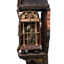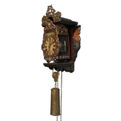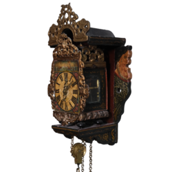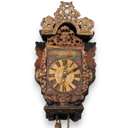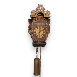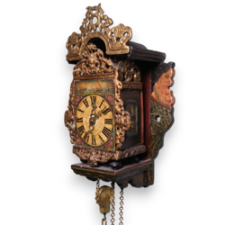 | Omschrijving | Een antieke 18e eeuwse Friese polychroom beschilderde miniatuur wandklok, zgn. 'stoelschippertje'. Houten, polychroom beschilderde stoel met zeemeerminnenachterwand. Wijzerplaat met Romeinse cijferaanduiding en beschilderd decor van scheepjes. Herkomst: veiling Christie's Amsterdam, The Decorative Arts Sale incl. Fine Paintings, 27 maart 2013, lot 619. |