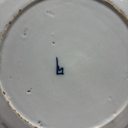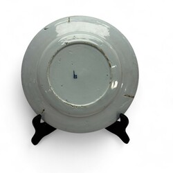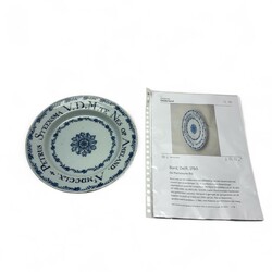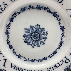 | Omschrijving | Een bijzondere en zeldzame gedateerde Delfts aardwerken herrineringsschotel, 23 cm doorsnede. Blauw/wit met op de rand de volgende tekst: Petrus Steensma V.D.M. te Nes op Ameland Ao MDCCLX (= 1760). Zie verdere info op papier bij deze schotel. Een zelfde schotel in de collectie van Het openlucht museum te Arnhem. Schotel gemerkt voor de Porceleijne Byl. |