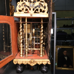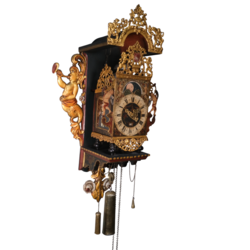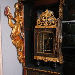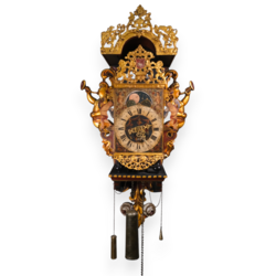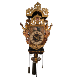 | Omschrijving | Een antieke 18e eeuwse Friese stoelklok. Polychroom beschilderde stoel, met twee bazuinspelende zeemeerminnen in de achterwand. Wijzerplaar met Romeinse en Arabische cijferaanduiding, maanstand en datumaanduiding, uurwerk met dubbele bel, met vergulde loden ornamentiek en twee blikken beschilderde bazoenblazende engelen. Klokkenmaker Rinse Durks (1712-1787), werkzaam te Grou. Eerder tentoongesteld in museum Joure. |