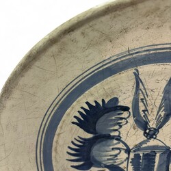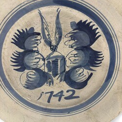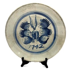 | Omschrijving | Een antieke 18e eeuwse Fries aardewerken schotel, met blauw-wit decor van een wapen en datering 1742. Herkomst: ex-collectie Minze van den Akker, zie boek p. 78. |