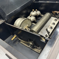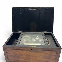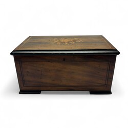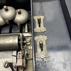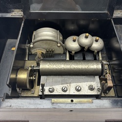 | Omschrijving | Een antieke 19e eeuwse Zwitserse speeldoos. Mahoniehouten kist, ingelegd met intarsia. Kam met alle naalden, trommel en bellen. |