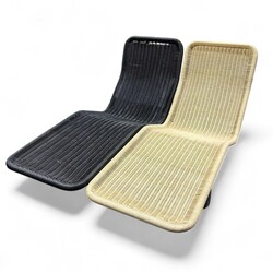 | Omschrijving | Twee jaren ’70 chaise longues op metalen onderstel, met kunststof rotan-stijl bekleding. Ontwerp Antti Nurmesniemi voor Tecta, Italië, model F10, ca. 1970 |