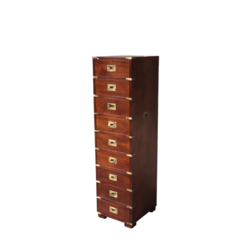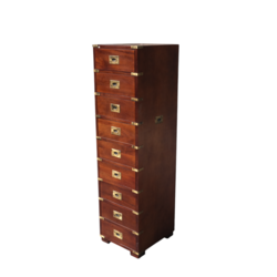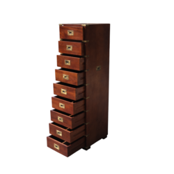 | Omschrijving | Een 20e eeuwse Engelse ladenkast in campaign furnitue stijl, met negen lades |