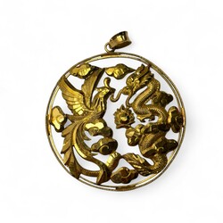 | Omschrijving | Chinese gouden ketting met ronde opengewerkte hanger met decor van een feniks en een draak, beide gekeurd |