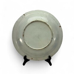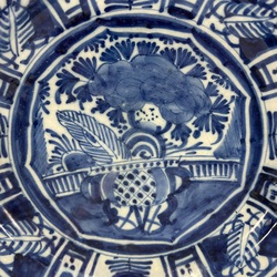 | Omschrijving | Blauw-wit gedecoreerde Delfts aardewerk schotel, in de stijl van het bekende Chinese ‘kraakporselein’, centraal met bloemenvaas en de rand met vlakverdeling, eerste helft 18e eeuw |