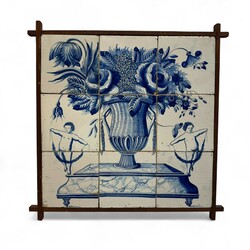 | Kavel | 334. Een Fries 18e eeuws negenpas tegeltableau met bloemenmand en putti. |