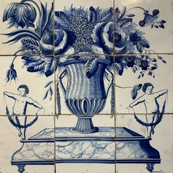| Omschrijving | Een Fries 18e eeuws negenpas tegeltableau, blauw/wit met urnvormige bloemenmand op standaard met aan weerzijdes een putti. Lijst van latere datum. |