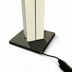 | Omschrijving | Een 20e eeuwse witmetalen vloerlamp op zwart basement, met witte neonverlichting en twee openslaande pilaren. Ontwerp Ettore Sottsass voor Arredoluce, model ‘14104’, zgn. ‘moonlight’ lamp. Ca. 1970. |
