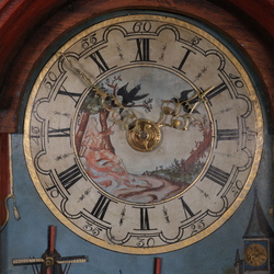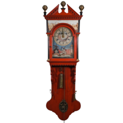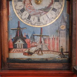| Omschrijving | Friese staartklok, dubbelkapper, met meekrap eikenhouten kast met open timpaankap en 3 koperen bollen, 5 slag mechaniek molen, toren, vissersmechaniek, dubbele bel, gesign. Pieter Scheffer (1752-1827), Sneek,