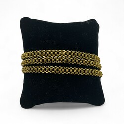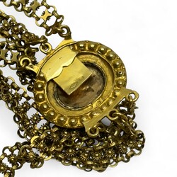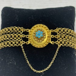 | Omschrijving | 18 karaats gouden driestrengs armband gedecoreerd met kleine filigrain bloempjes, de ovale sluiting met centraal bloem ornament ingelegd met zeven turquois steentjes |