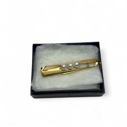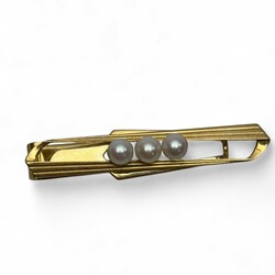| Omschrijving | 14 karaats gouden dasspeld met drie pareltjes, meesterteken K. Mikimoto, Tokyo |