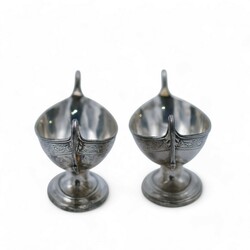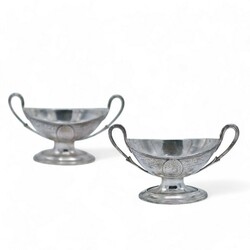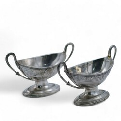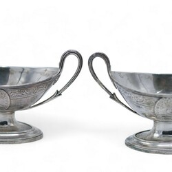 | Omschrijving | Twee 18e eeuwse Louis XVI stijl zoutvaatjes. Gemerkt met staande leeuw, stadskeur van Den Haag, jaarletter V (1792) en onduidelijk meesterteken. |