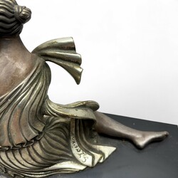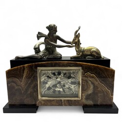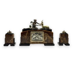 | Omschrijving | Een driedelige art deco pendule, ca. 1930, bestaande uit een klok en twee bijbehorende zijstukken. Zwart en bruin geaderd marmeren kast, met bovenop de klok een verzilverde voorstelling van een naakte vrouw met een antilope, aan de achterzijde gesigneerd 'G. Lavroff. Verzilverde wijzerplaat in art deco stijl met jachtvoorstelling, twee zijstukken bekroond met liggende dieren in dezelfde stijl. |