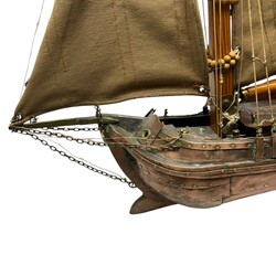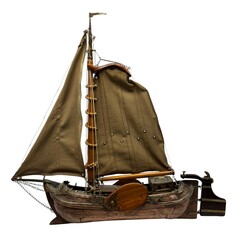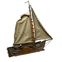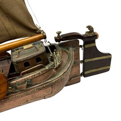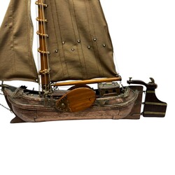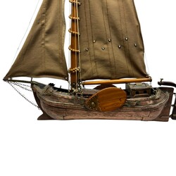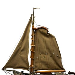 | Omschrijving | Houten modelboot: skûtsje, bijzonder exemplaar, want uit diverse materialen opgebouwd: de romp met koperen plaatjes en messing nagels, het zwaard en de mast van blank hout, en de zeildoeken van katoen met elastine |