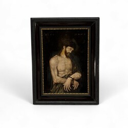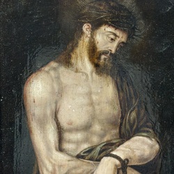 | Omschrijving | Schilderij: lijdende Jezus Christus, met tekenen van geseling en de doornenkroon op zijn hoofd, bovenaan met opschrift ‘Ecce Homo’ [Zie de mens], olieverf op paneel, 17e/18e eeuw, in donker houten robbelijst |