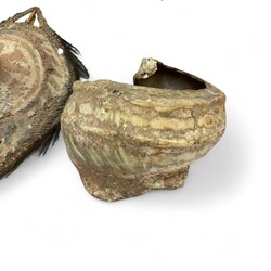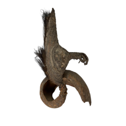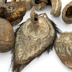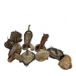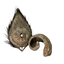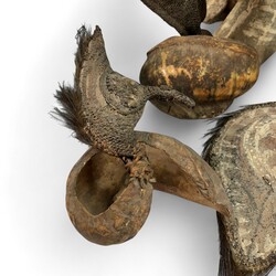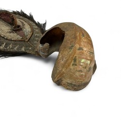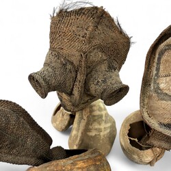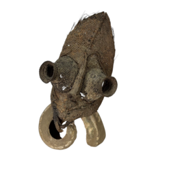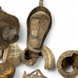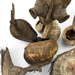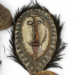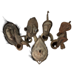 | Omschrijving | Lot van zeven ‘Talipun’, bruidsgeld, Papua-Nieuw Guinea, Sepik. Bestaande uit zeeschelpen, met daaraan bevestigd geweven maskers, versierd met pigmenten. |