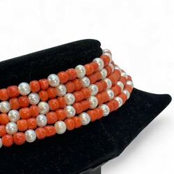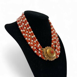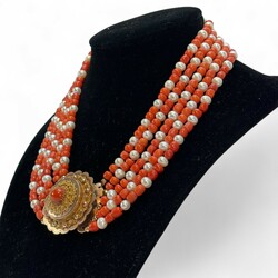 | Kavel | 336. Vijfstrengs collier met bloedkoraal en parels |