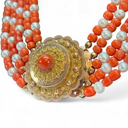 | Omschrijving | Vijfstrengs collier met afwisselend twee bloedkoralen en een parel per streng, aan 14 karaats gouden cannetille slot bezet met gepolijstje koraal, sluiting uit circa 1900 |