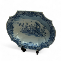 | Omschrijving | Een vroeg 18e eeuwse Delfts aardewerken serveerschaal of plaquette, 27 x 33 cm. Blauw/wit met een fijn geschilderd Chinoiserie decor van figuren in een Oosterse tuin. Twee delen gelijmd. Ca 1730. |