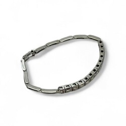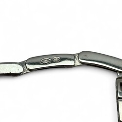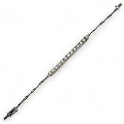 | Omschrijving | Een 20e eeuwse 14 karaats (585/1000) witgouden schakelarmband met negen schakels, centraal bezet met dertien briljant geslepen diamanten. Aan de zijkant gekeurd met eikenblaadje ‘585’. Met veiligheidssluiting. |