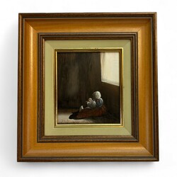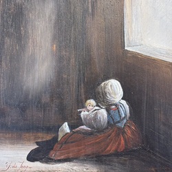 | Omschrijving | Ytje de Jong (1948), voorstelling met spelend meisje met popje, olieverf op paneel, linksonder gesigneerd, in houten lijst met vergulde bies en gestoffeerde rand |