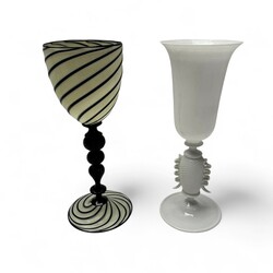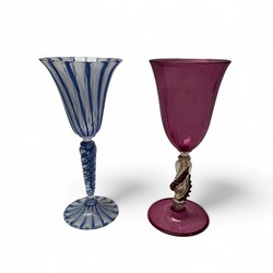 | Omschrijving | Zeven glazen bokalen, diverse vormen en kleuren, alle Murano, Italië, waaronder een blauw-wit ‘lacework’ bokaal met verguldsel in de gedraaide voet, groene bokaal met achtkantige kelk, en opaline bokaal met gedraaide voet en slingers |