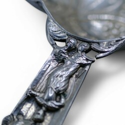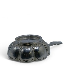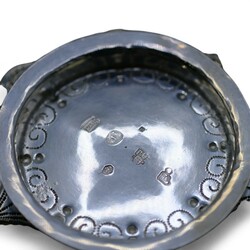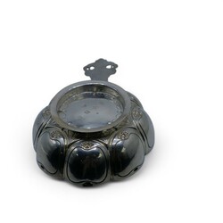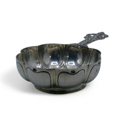 | Omschrijving | Een laat 19e eeuwse Fries zilveren brandwijn- of papkom, gelobd model met één greep, versierd met vrouwfiguur. Aan de onderzijde gekeurd met diverse pseudokeuren, lopende leeuw en meesterteken van Alle de Haas, zilversmid te Sneek van 1877 tot 1923. |