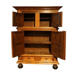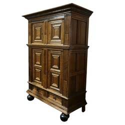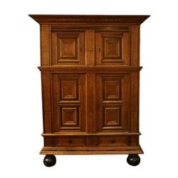 | Omschrijving | Een laat 17e eeuwse eikenhouten met coromandel houten vierdeurs kussenkast rustend op bolpoten. |
