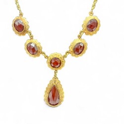 | Omschrijving | Een vierdelige carneolen sieradenset : een 20e eeuws 14 karaats (585/1000) geelgouden collier, bestaande uit vijf ovale schakels en één druppelvormige hanger, twee ronde oorknoppen met gefacetteerde carneool, een gouden damesring met ovale carneool en een langwerpige broche met gefacetteerde carneool |