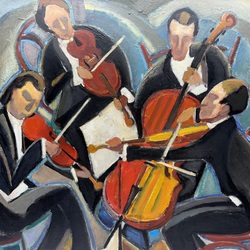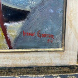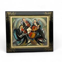| Omschrijving | Schilderij, olieverf op schildersboard. 'Het kwartet'. Rechtsonder gesigneerd Henk Gorter (Sneek 1908 - Renkum 1974), gedateerd 1954. In Gehring & Heijdenrijk lijst. Herkomst: kunsthandel Mark Smit, Ommen. |