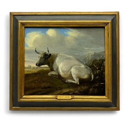 | Omschrijving | Schilderij, olieverf op paneel. Liggende koe in landschap. Draagt signatuur Paulus Potter en datering 1649. Op de achterzijde met twee lakstempels. |